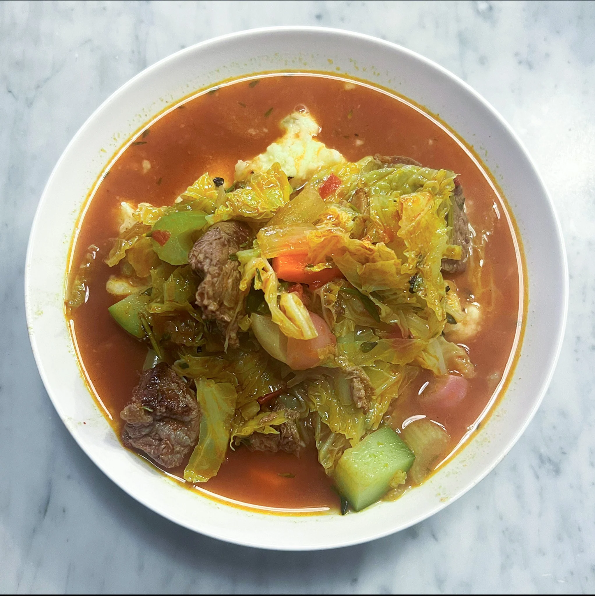 What do you get when you slow braise stew meat with a bounty of vegetable deliciousness, and then ladle it over classic mashed potatoes?