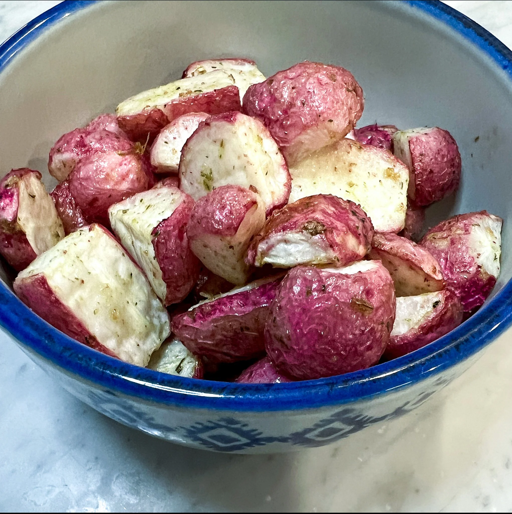Radishes should be crisp on the outside, but not too brown. And tender on the inside.