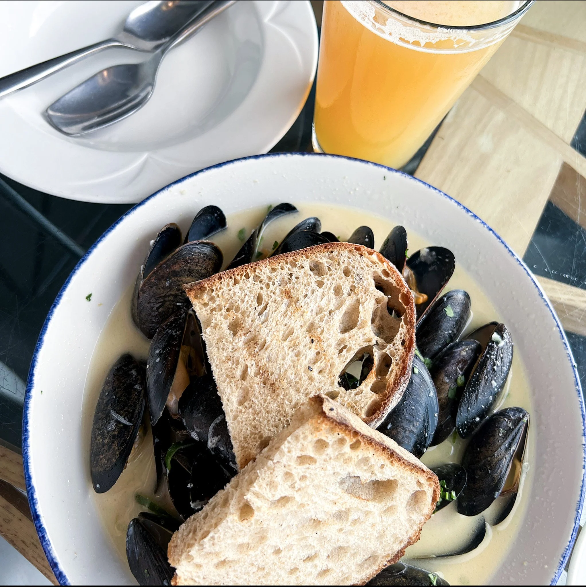 mussels: tokyo negi, white wine-mustard cream sauce, grilled bread