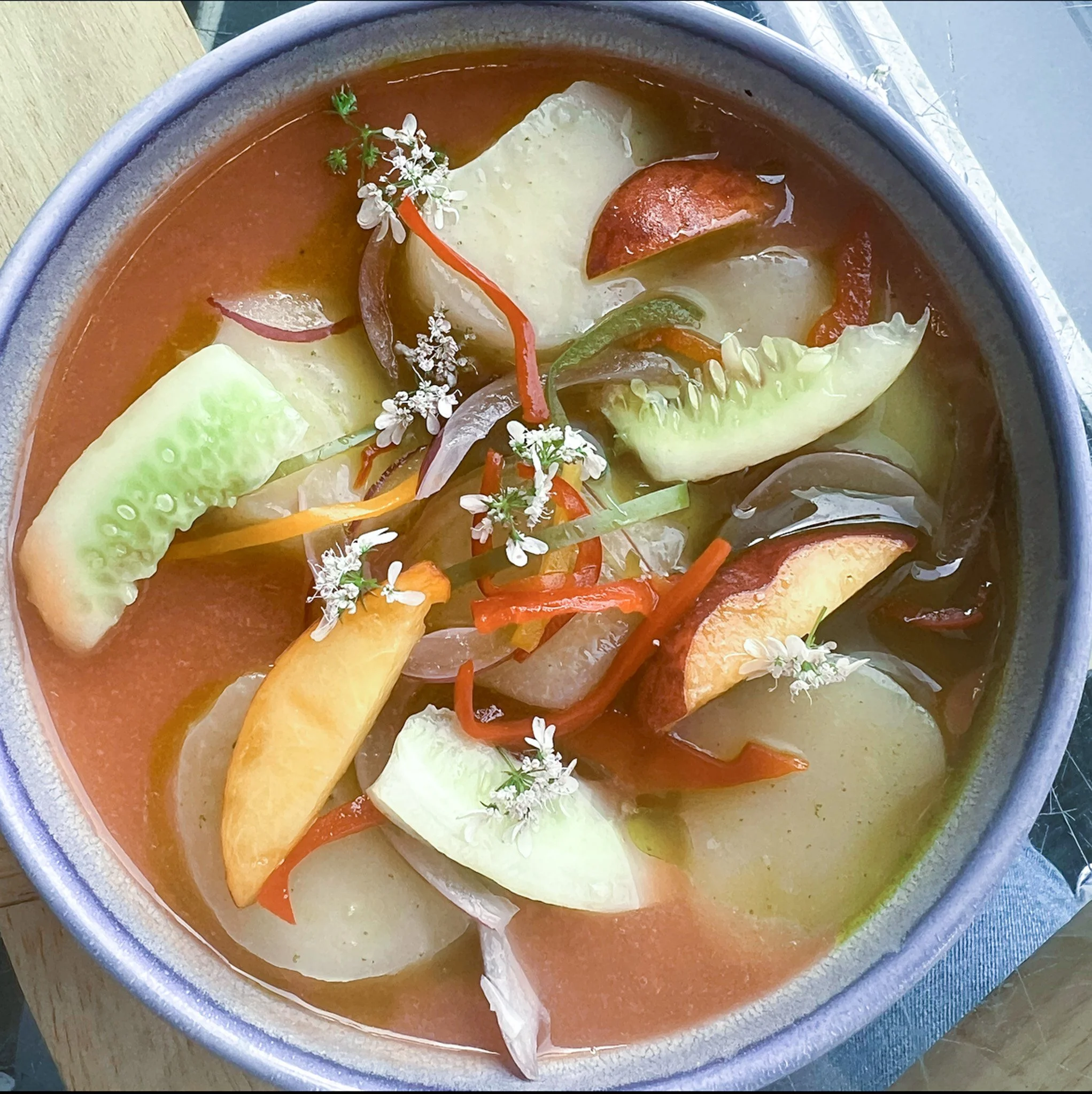 hokkaido scallop crudo: peach gazpacho, habanero, cilantro oil