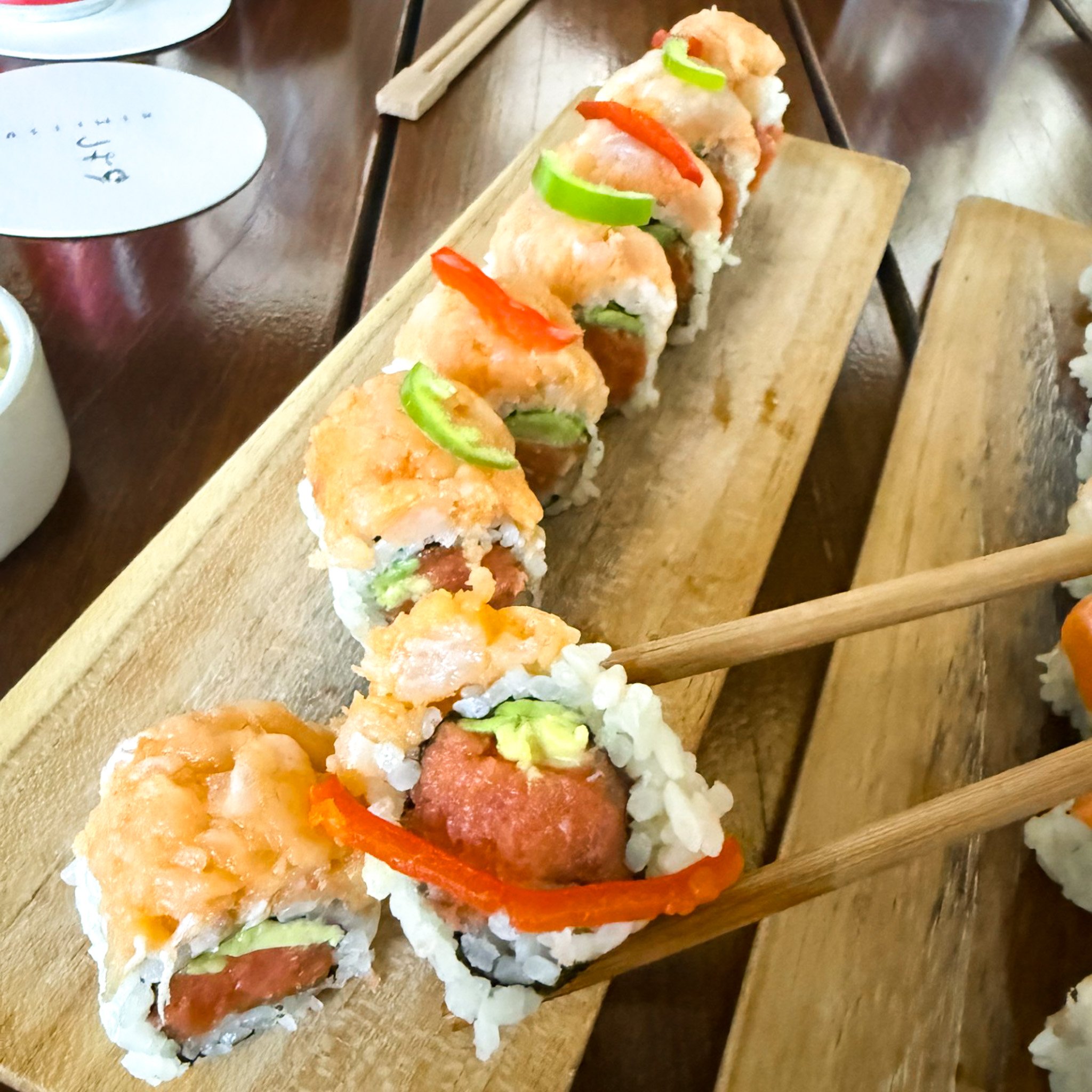 Perfect combo of spicy tuna, classic salmon with creamy avocado, the heat of serrano and the sweet of ponzu. Excellently composed bite.