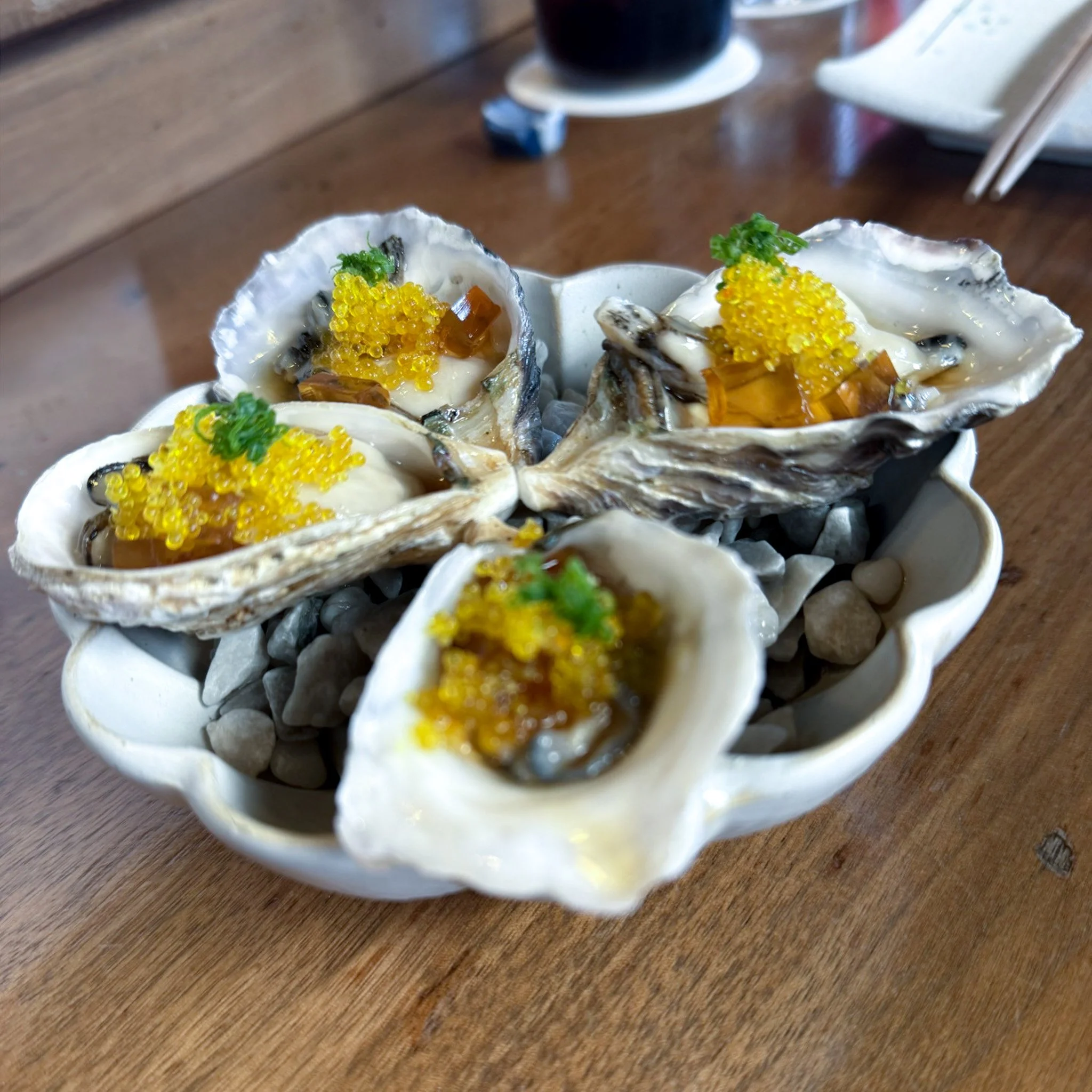 shigoku oysters: tosazu gelee, yuzu tobiko, chives