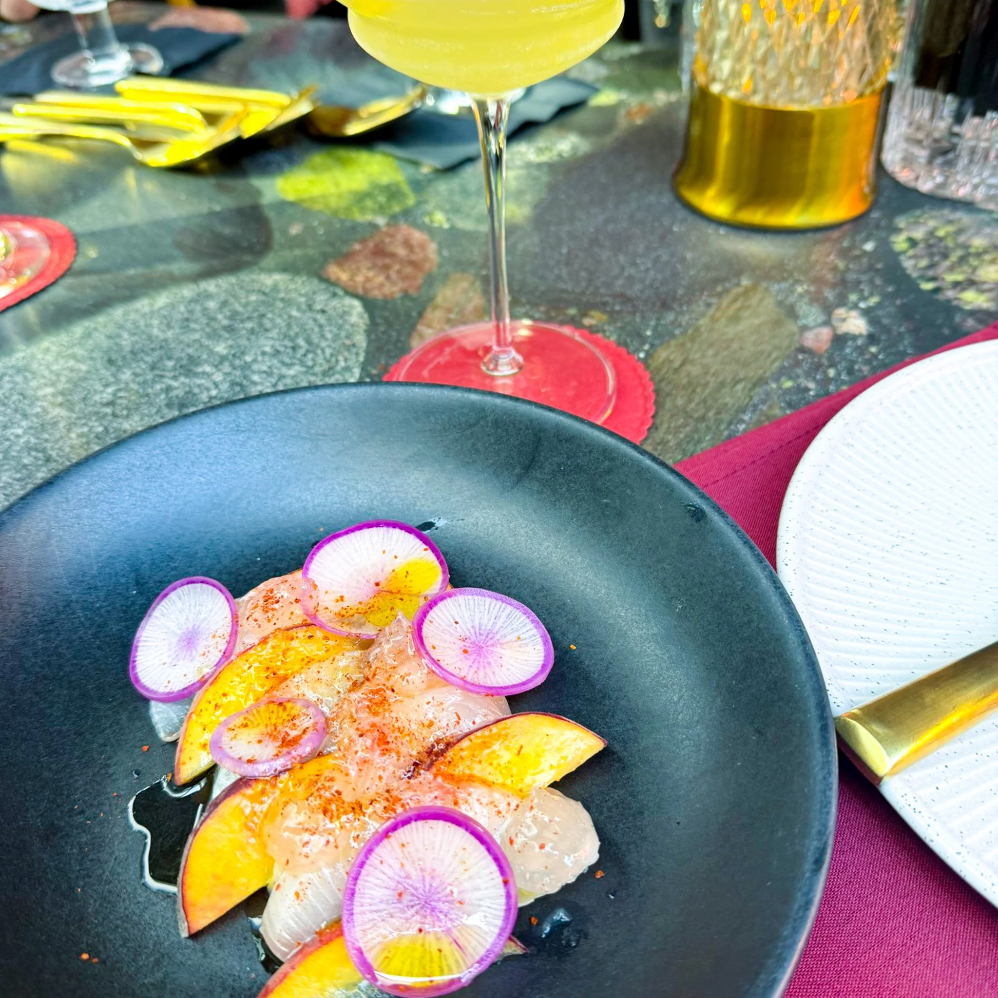 kanpachi: peaches, eplette, shallot jam, yuzu, opal basil, radish