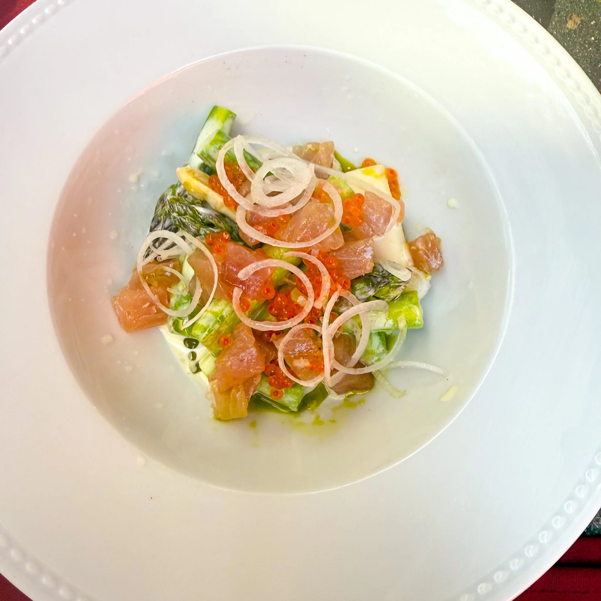 Talk about the perfect spring bite. It’s all the freshness of this season… that, combined with the slight heat from the esplette, the shallot jam, and the acidity of the yuzu made such a great bite.