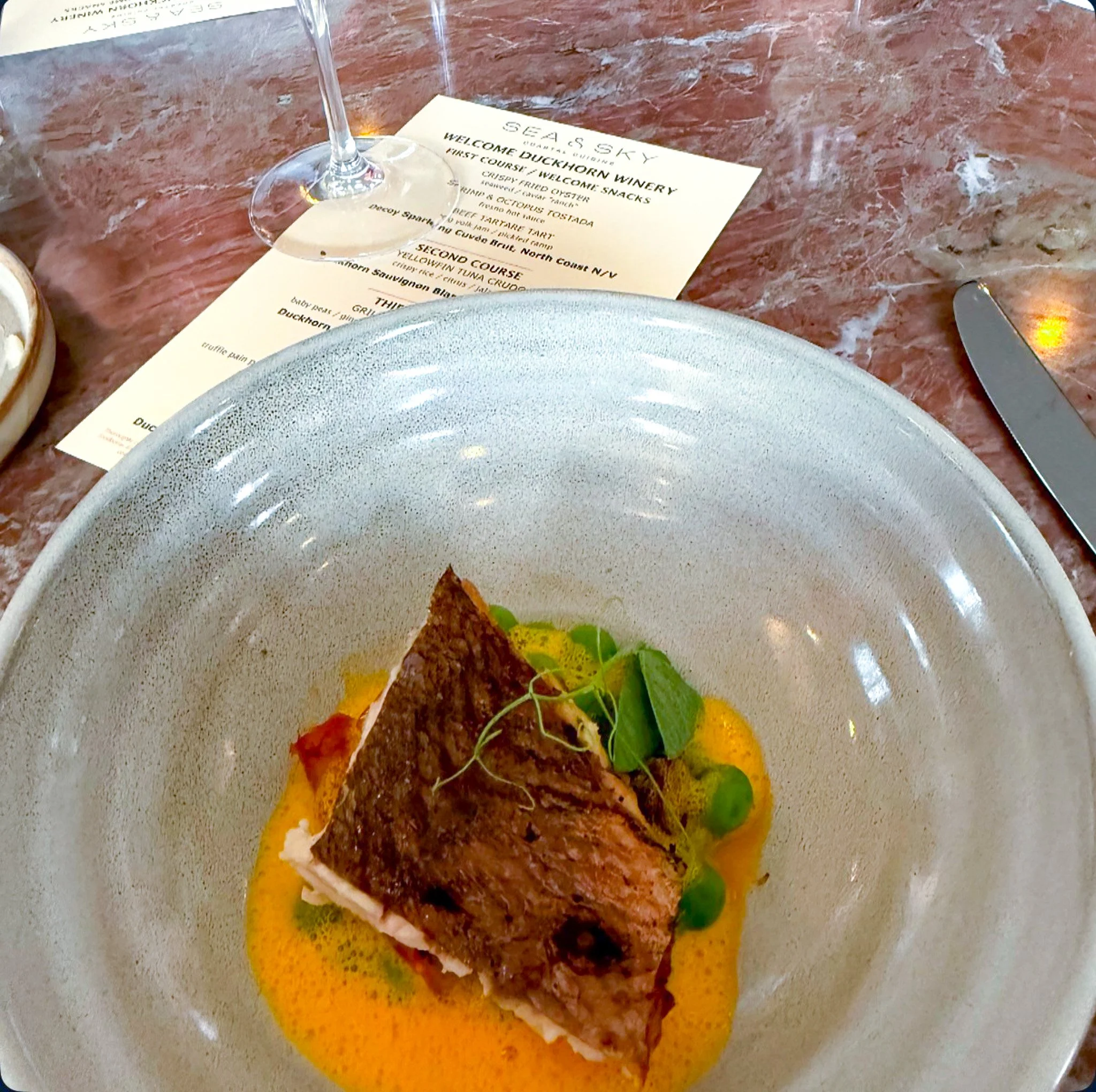 Went to a collaboration between duckhorn winery and sea & sky with my brother recently. Y’all know I love all the seafood at sea & sky, so was excited to see what they would do with a wine pairing menu.