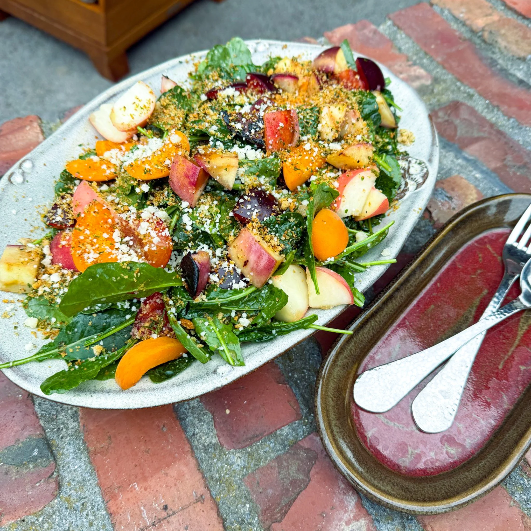 stone fruit and kale salad: dates, walnuts, parmesan, breadcrumbs