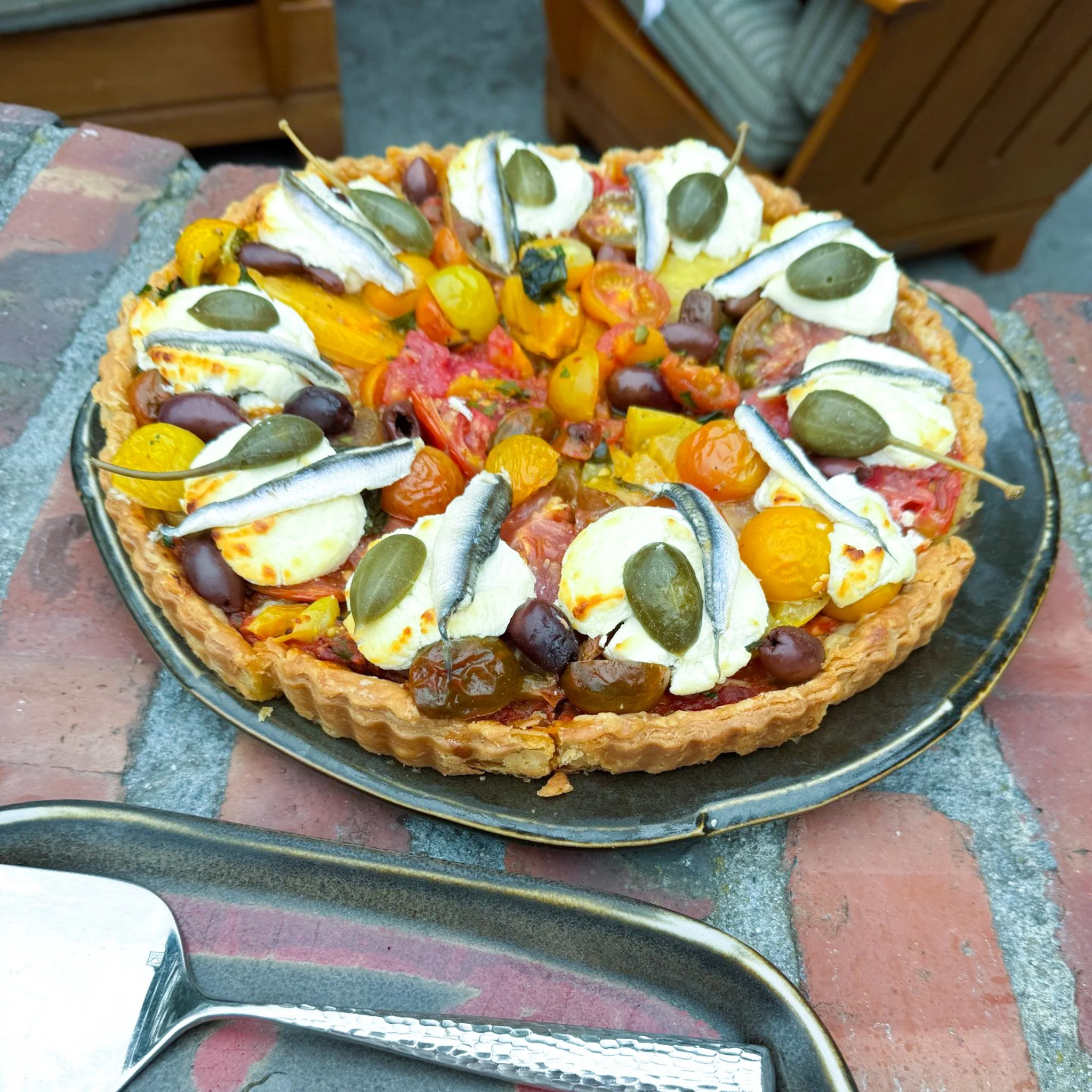 puttanesca tart: tomato, garlic, anchovy, capers, olives, chili flakes