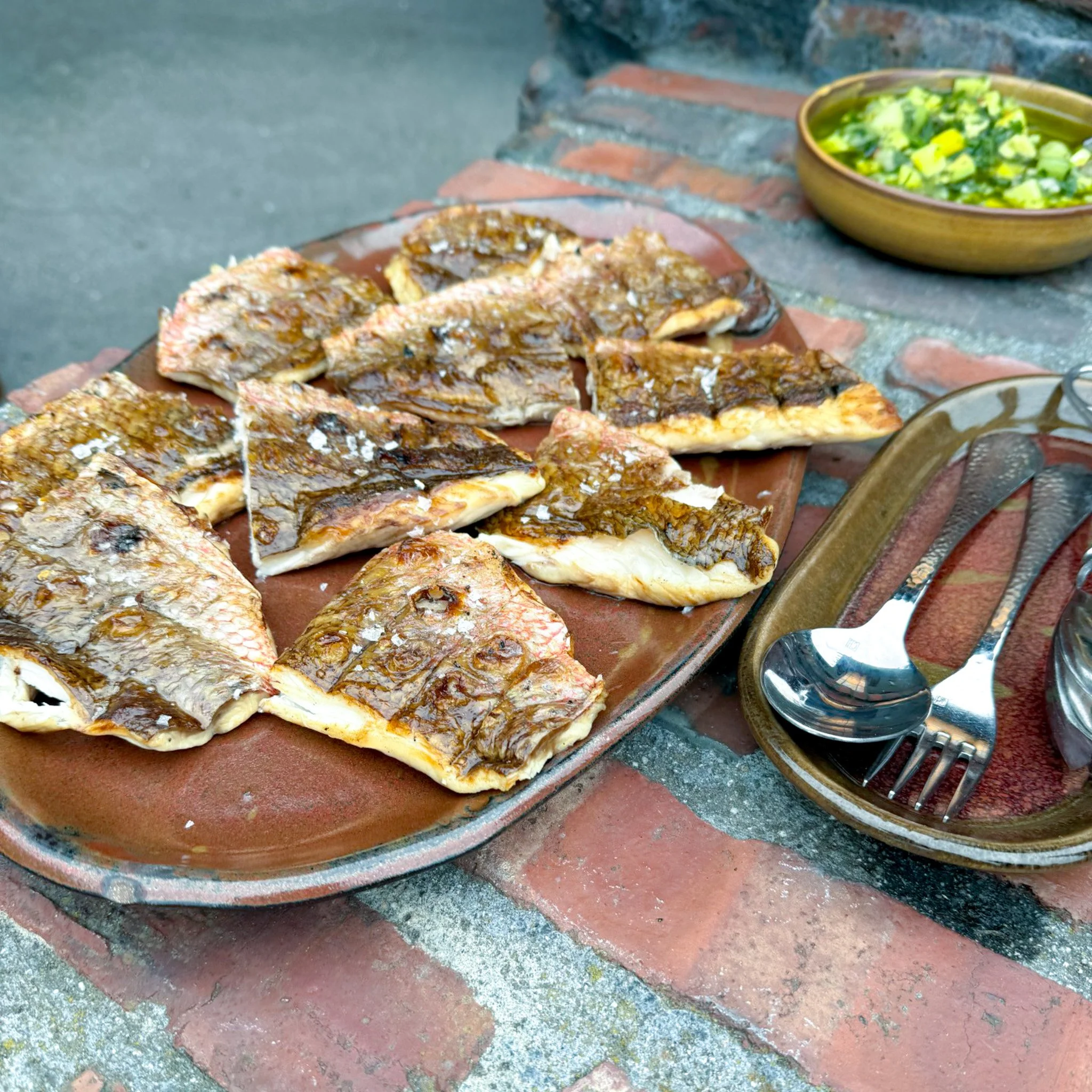 grilled rose snapper: kiwi, avocado, pineapple, herb salsa verde